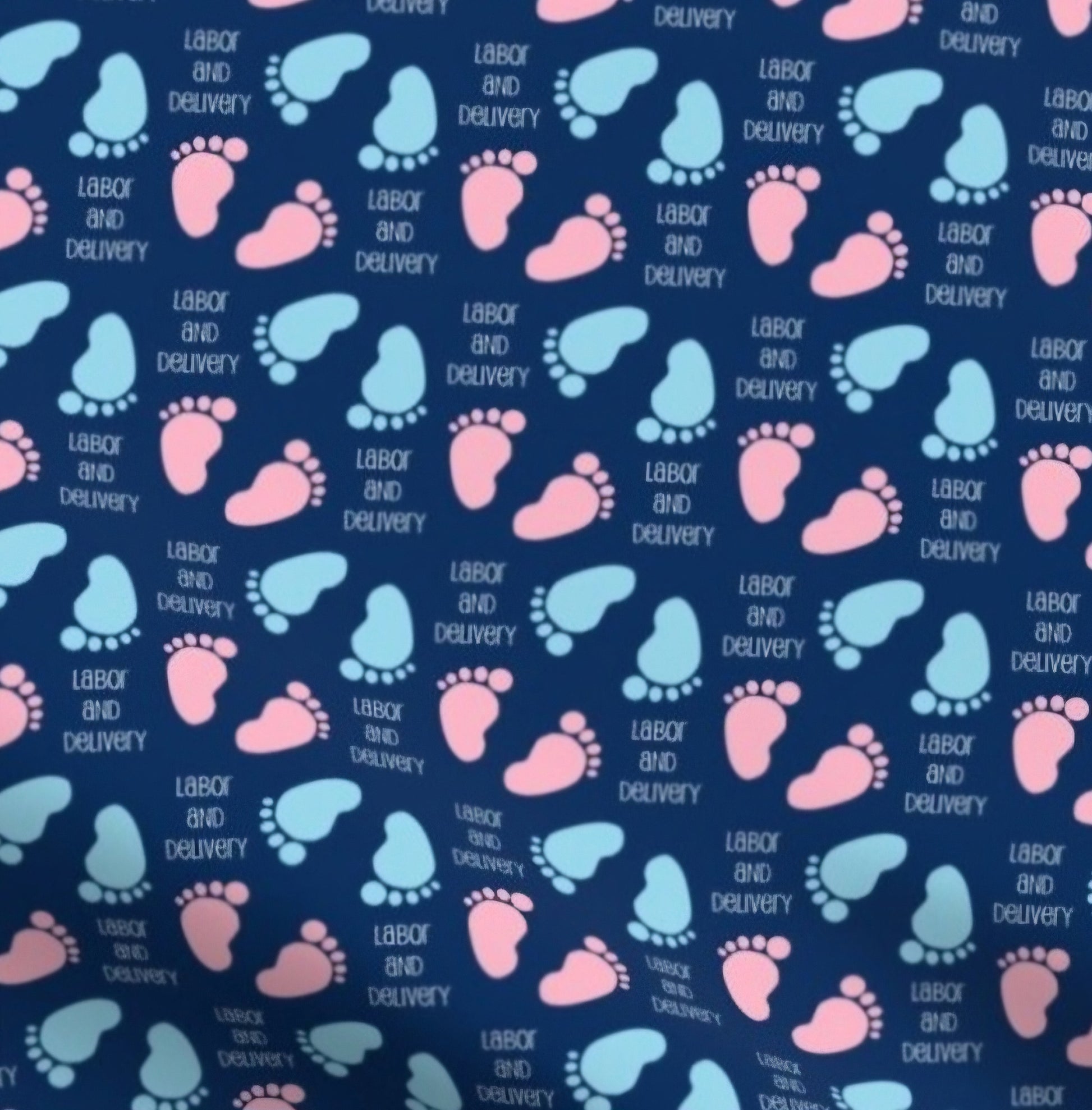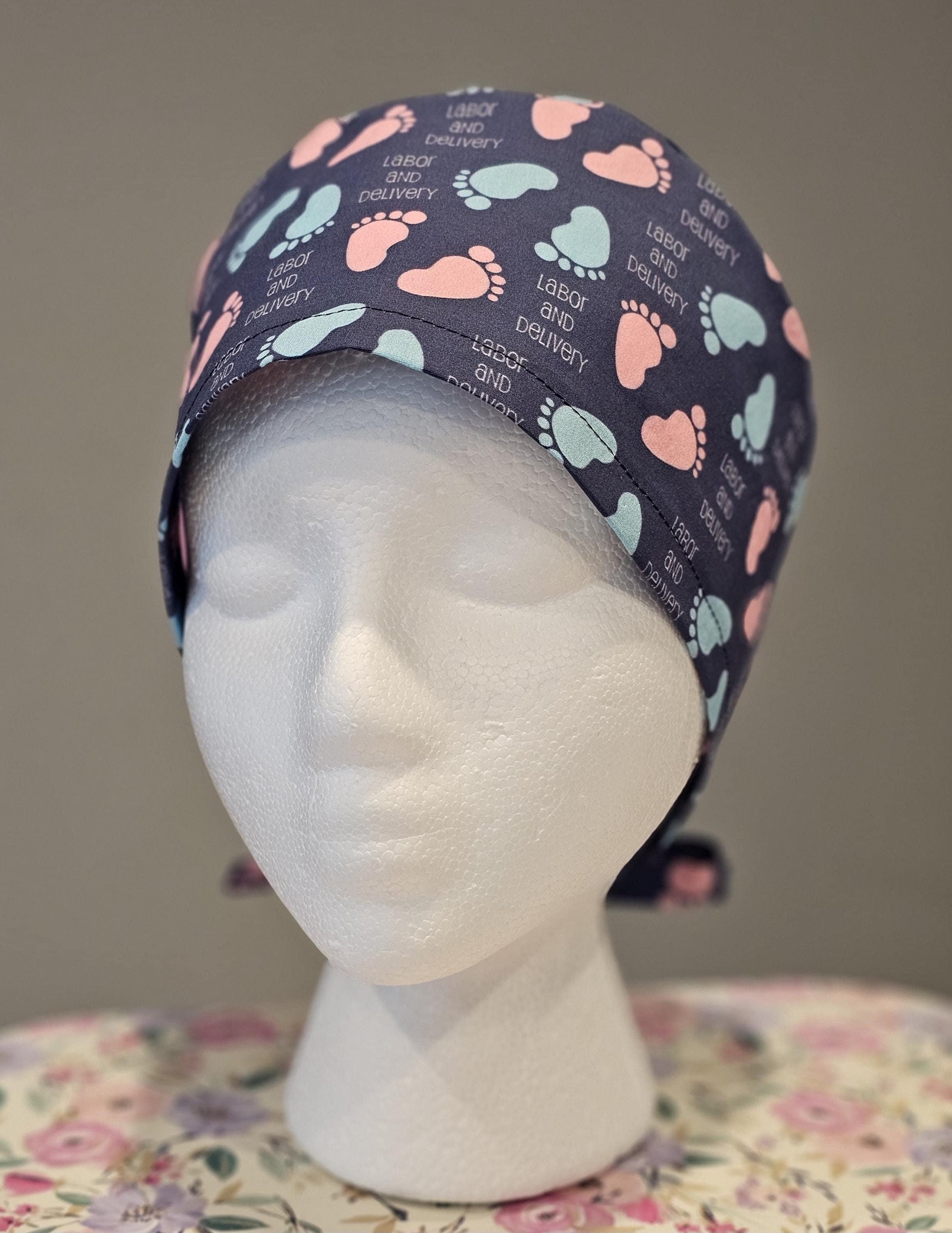 Labor and Delivery Blue and Pink Baby Feet on Dark Blue Scrub Caps